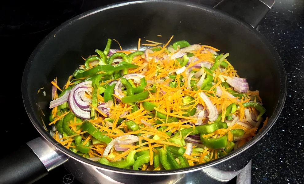 - В большой сковороде разогрейте немного оливкового масла. Обжарьте лук, морковь и перец на среднем огне около 5 минут, помешивая.