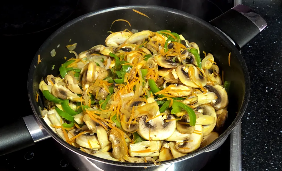 - Добавьте грибы, соль, перец и жарьте ещё 5 минут.
