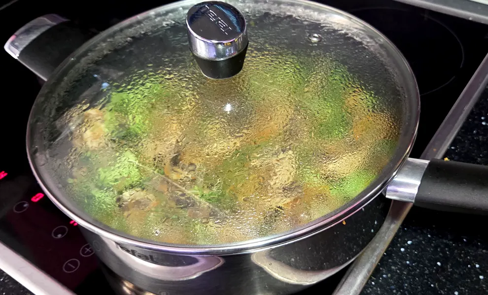 - Добавьте чеснок, влейте бульон, аккуратно перемешайте. Накройте крышкой и тушите пару минут.